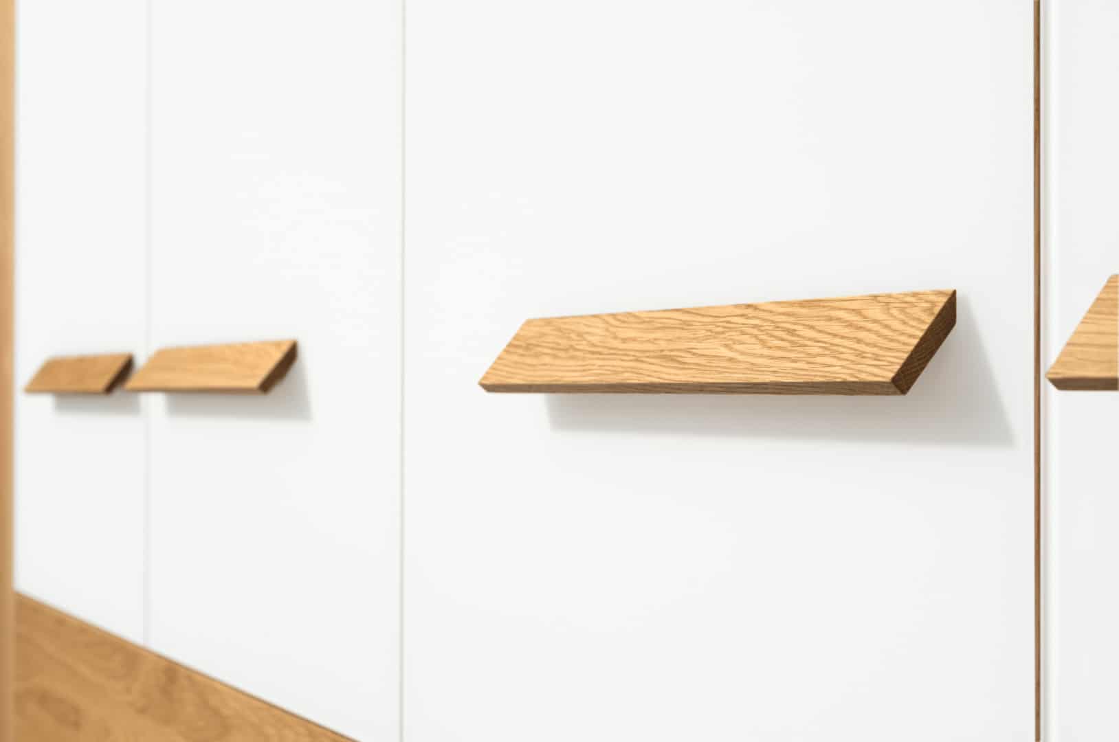 Die Türfronten von Kleiderschrank SOFT sind erhältlich in Holz, Glas oder Spiegel und mit 8 verschiedenen Griffvarianten.